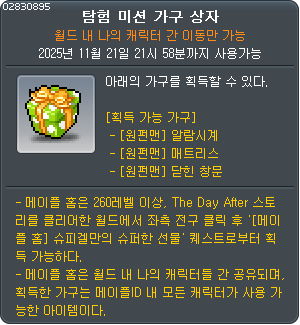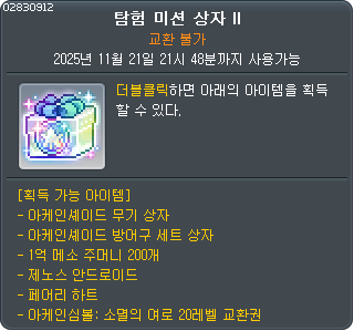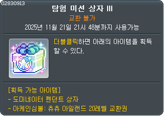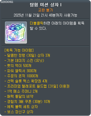 | 메이플 월드 | 정령의 펜던트 교환권 (30일) | 탐험 미션 상자 I |