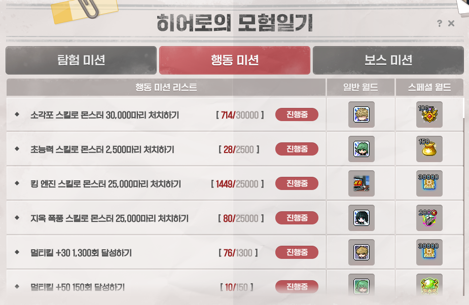 일반월드 보상은 '히어로의 모험일기' 탭을 통해 받을 수 있습니다.