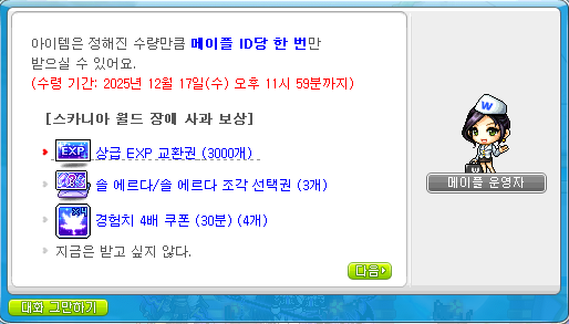 스카니아 월드 장애 사과 보상입니다.