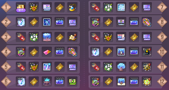 출석 시 3배(30분) 3개, 기억빛 흔적 5개, 추억빛 흔적 5개