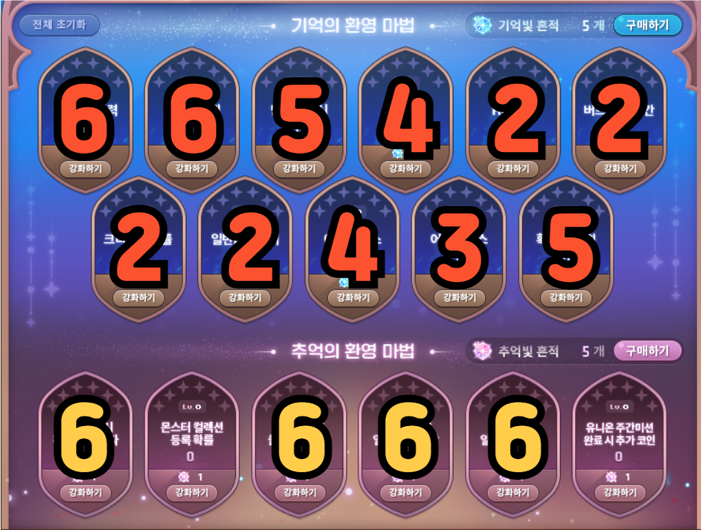 출석 시 얻는 기억빛 흔적, 추억빛 흔적을 사용해 원하는 보약 능력치를 찍는 이벤트입니다.