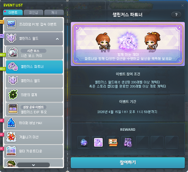 참여 대상 : 챌린저스 월드에 생성된 200 레벨 이상 캐릭터