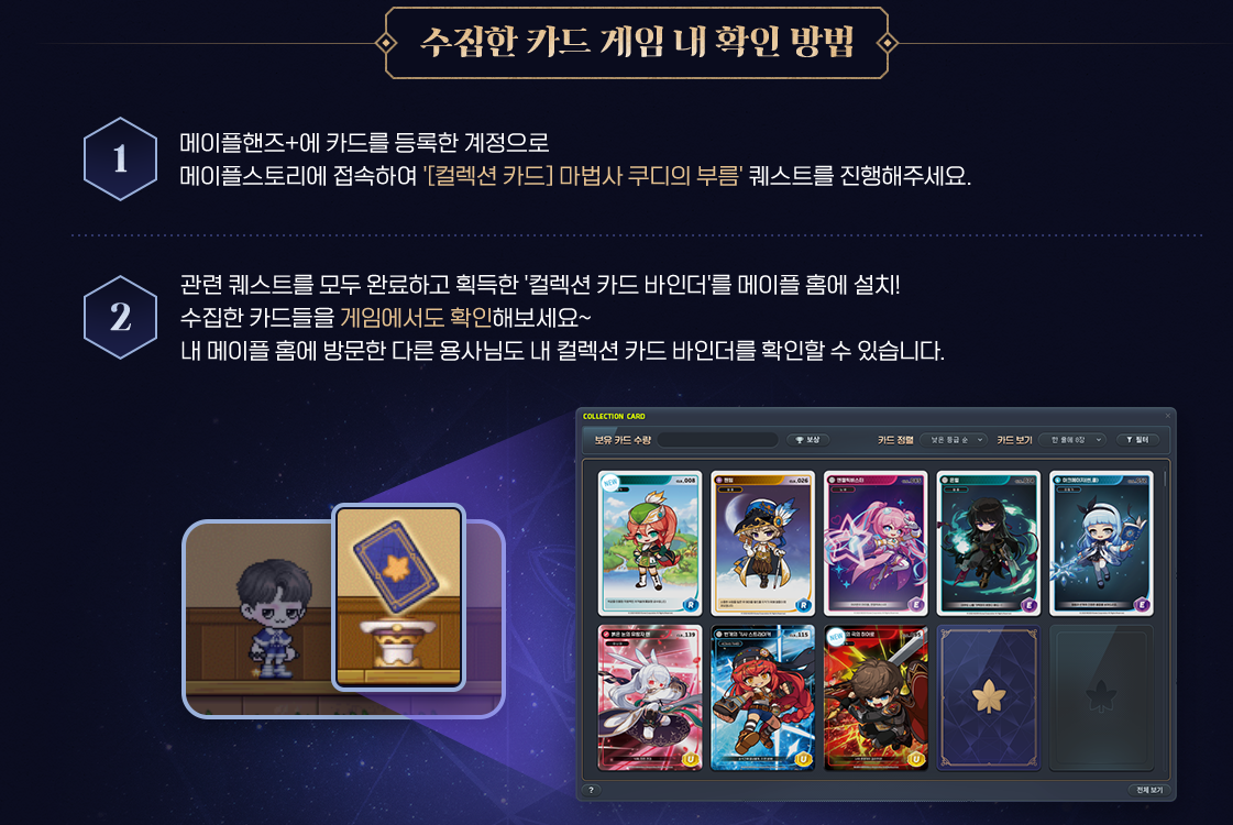 인게임에선 메이플 홈 에서 수집한 카드를 확인 가능합니다.