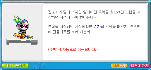 퀘스트 수락 후 추억의 길3 에서 몬스터 50마리 잡은 뒤 돌아가줍니다.