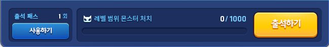 레벨 범위 몬스터 1000마리를 처치하여 출석을 완료 가능합니다.