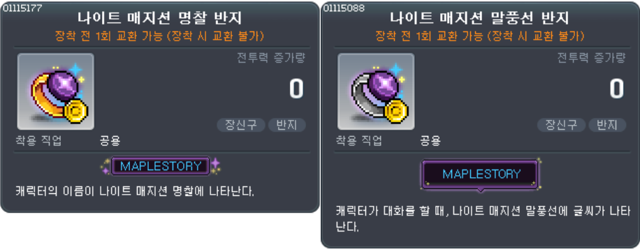 | 나이트 매지션 명찰/말풍선 반지 | 나이트 매지션 데미지 스킨 | |