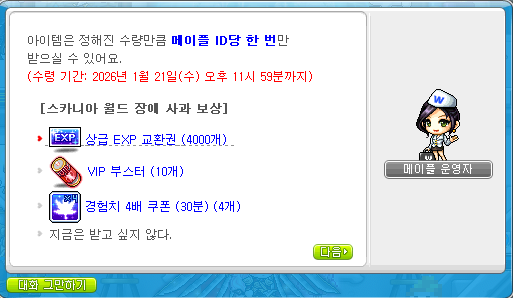 마을 > 빠른 이동(좌측 상단) > 메이플 운영자 > 보상 수령