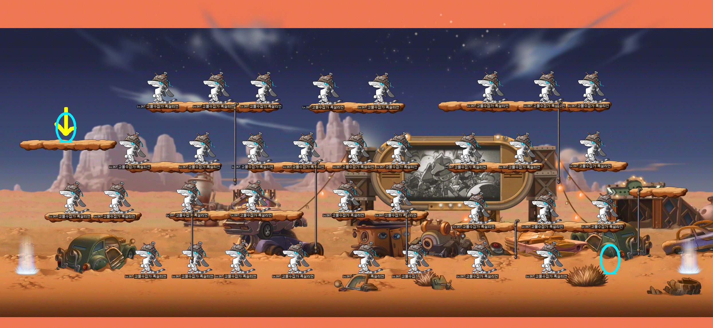 파란색 포탈 : 히든 포탈 | 노란색 화살표 : 캐릭터 스폰위치